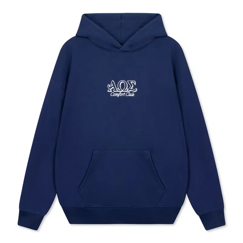Medieval Blue hoodie with a slightly oversized fit in a heavy weight jersey cotton. Super soft, pre-shrunk and piece dyed for the ultimate jersey. Ribbed hem & cuffs. Comfort Club Omega embroidery to the chest & back.